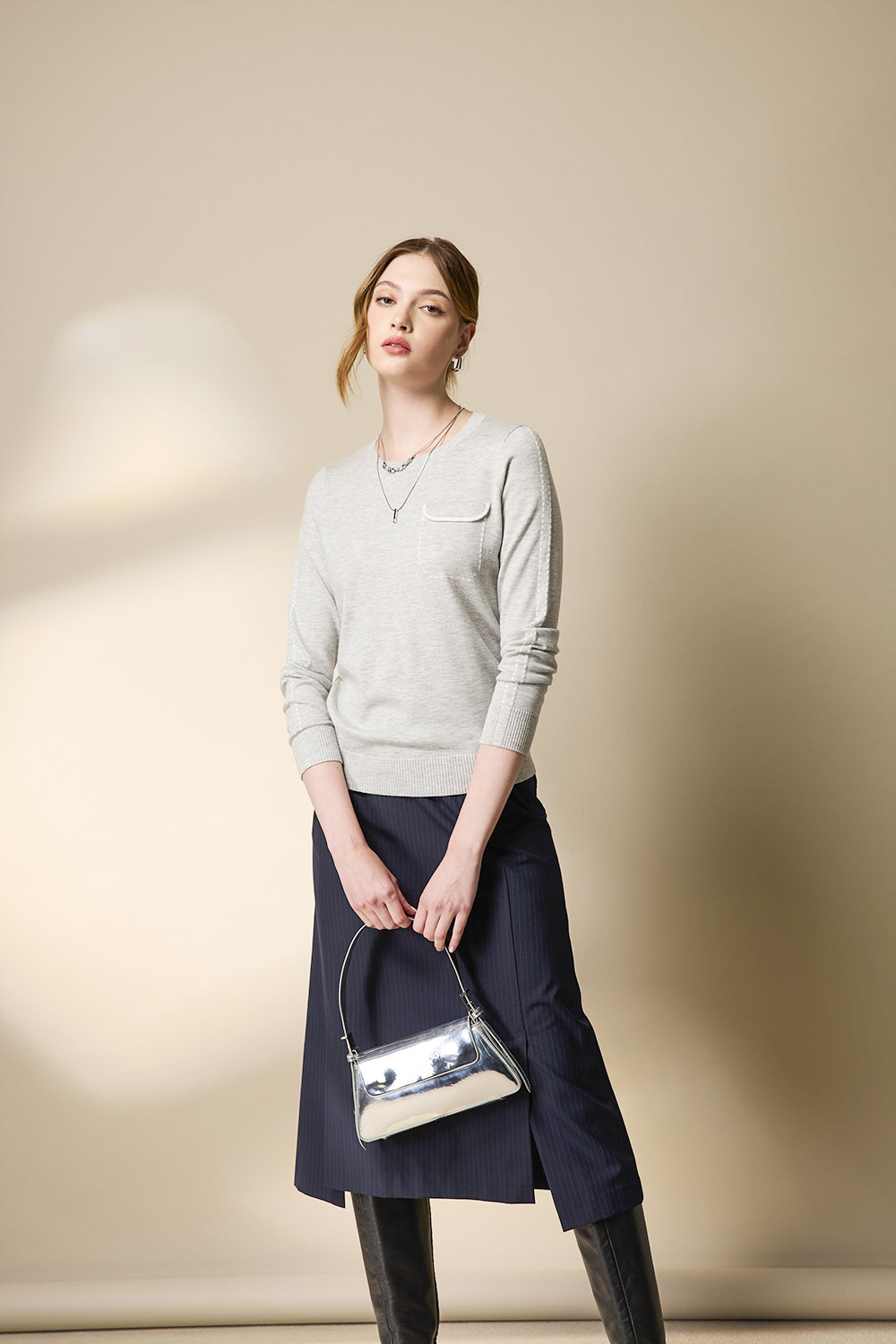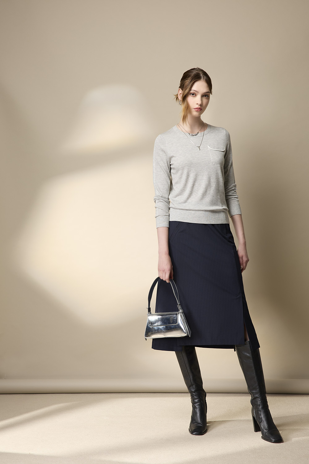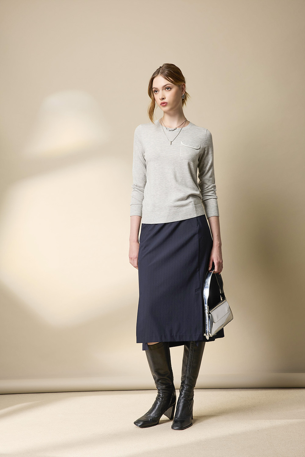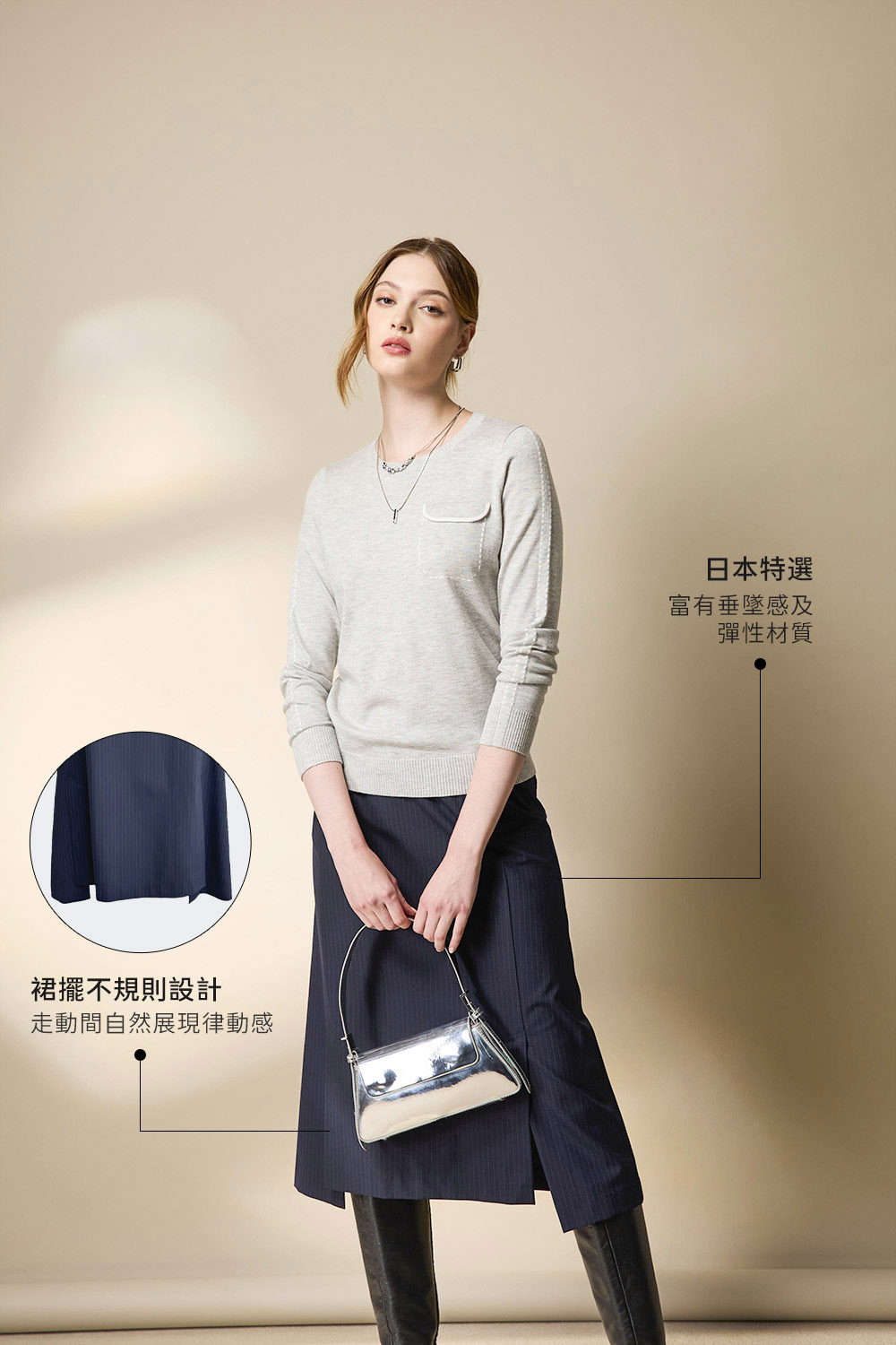 高腰的版型不僅拉長身形,也能展現知性優雅的氣質,中長版的裙長能自然修飾腿部比例