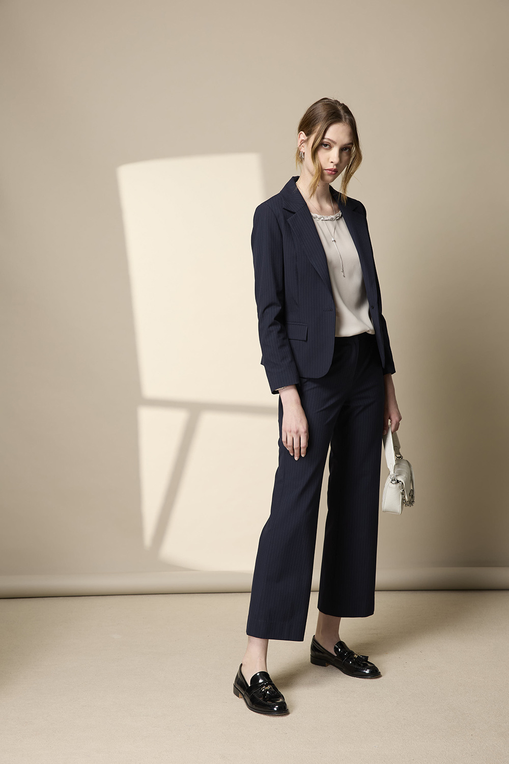 【2025 條紋經典主題】整體以日式細緻條紋打造俐落視覺層次,搭配修身剪裁與垂墜感布料,兼顧舒適與專業氣場;不論商務穿搭或法式溫柔風格都能完美演繹