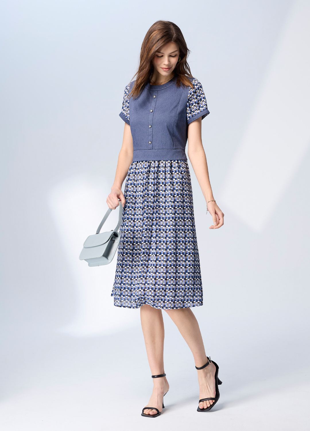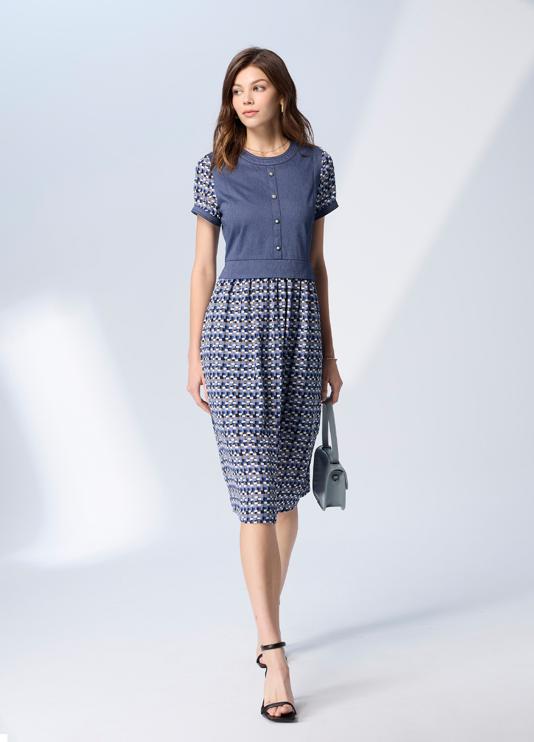 【2025 都會花格主題】以仿牛仔材質打造上身視覺,結合幾何花格下身拼接,呈現假兩件層次設計,巧妙融合俐落與柔美,詮釋都市女性的知性穿搭哲學
