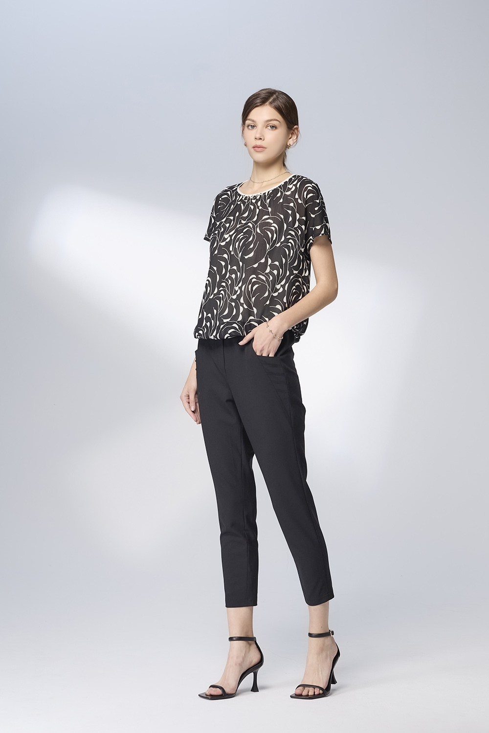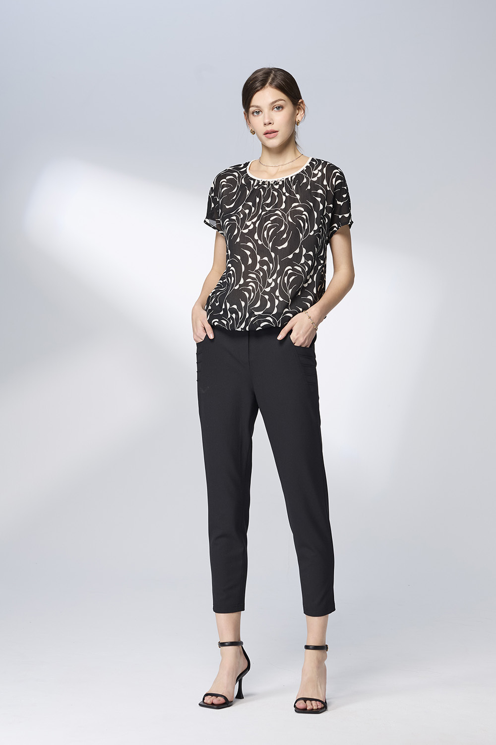 從都市午後的咖啡廳,到辦公室裡的簡報現場,以黑白花影圖騰打造柔中帶剛的女性魅力