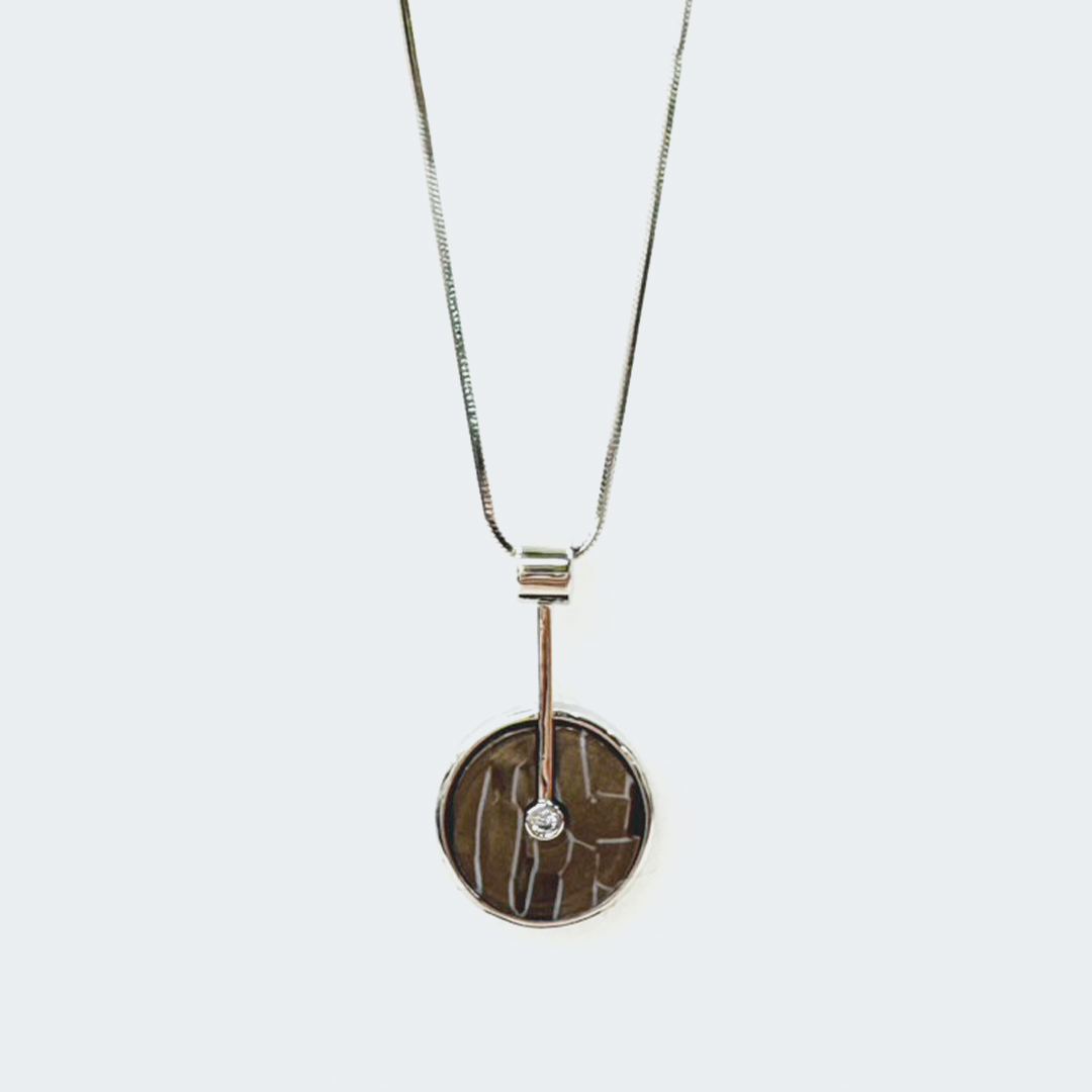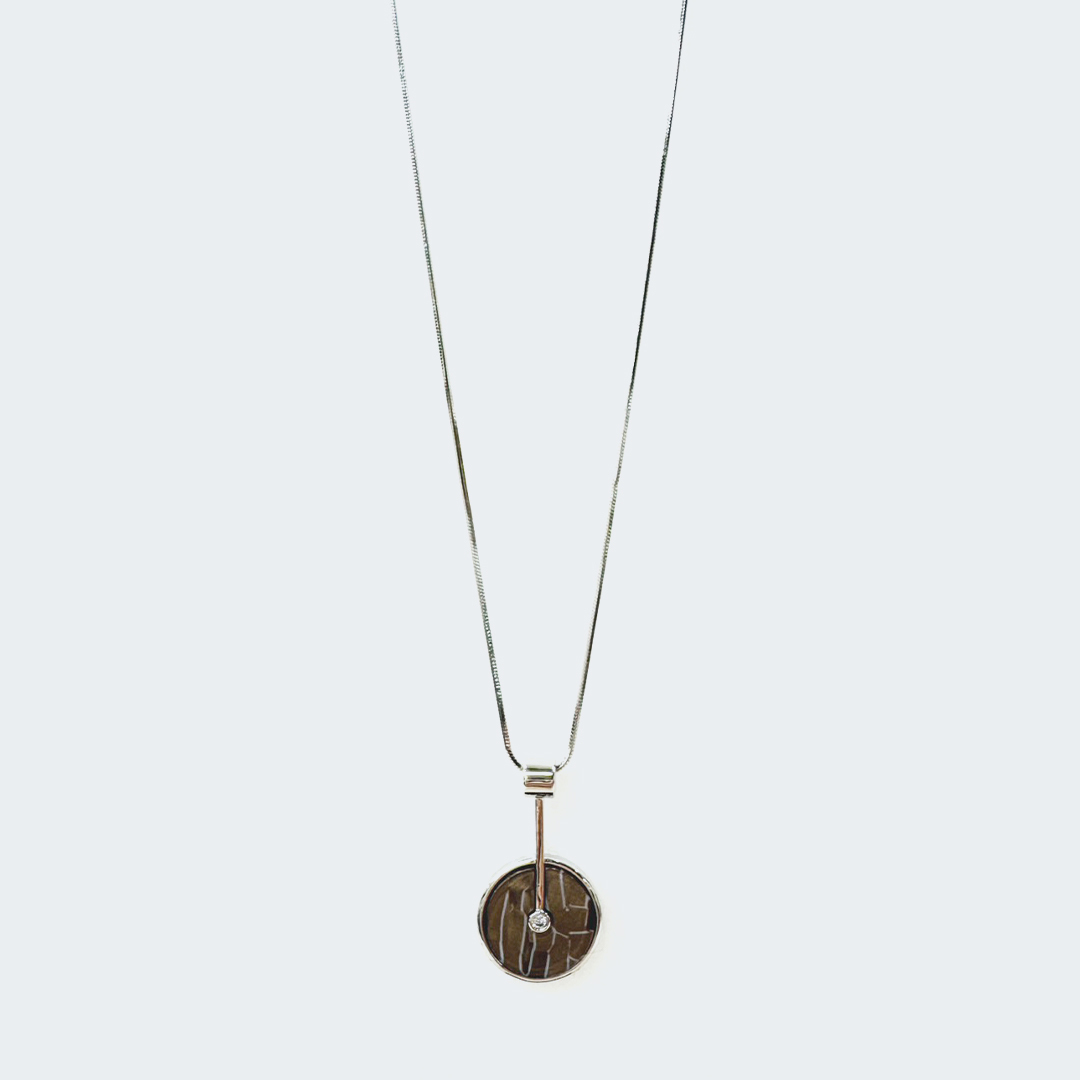 吊墜以圓形幾何造型為主體,內嵌壓克力纖維材質,表面呈現細緻紋理,透過光線映照出低調光澤