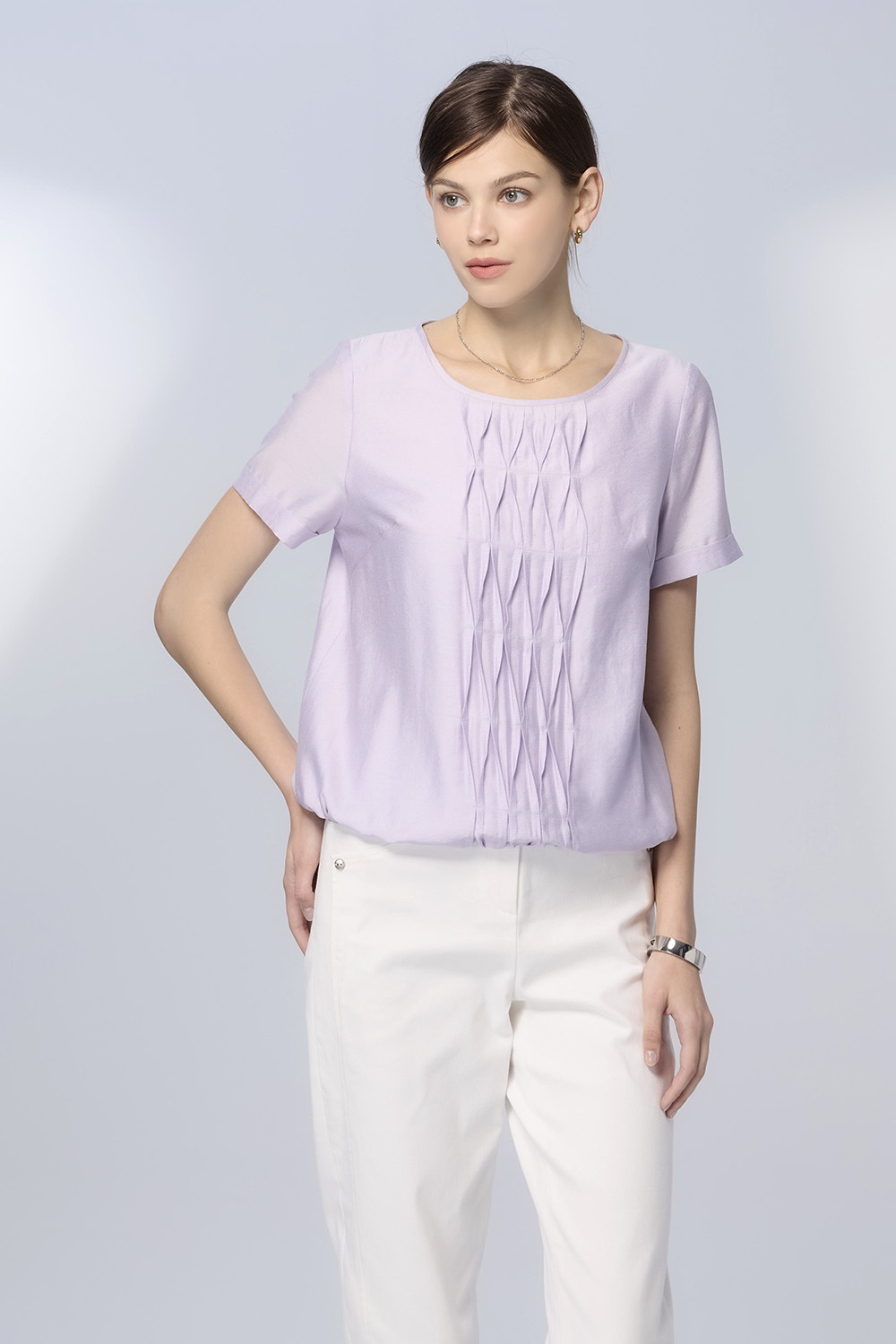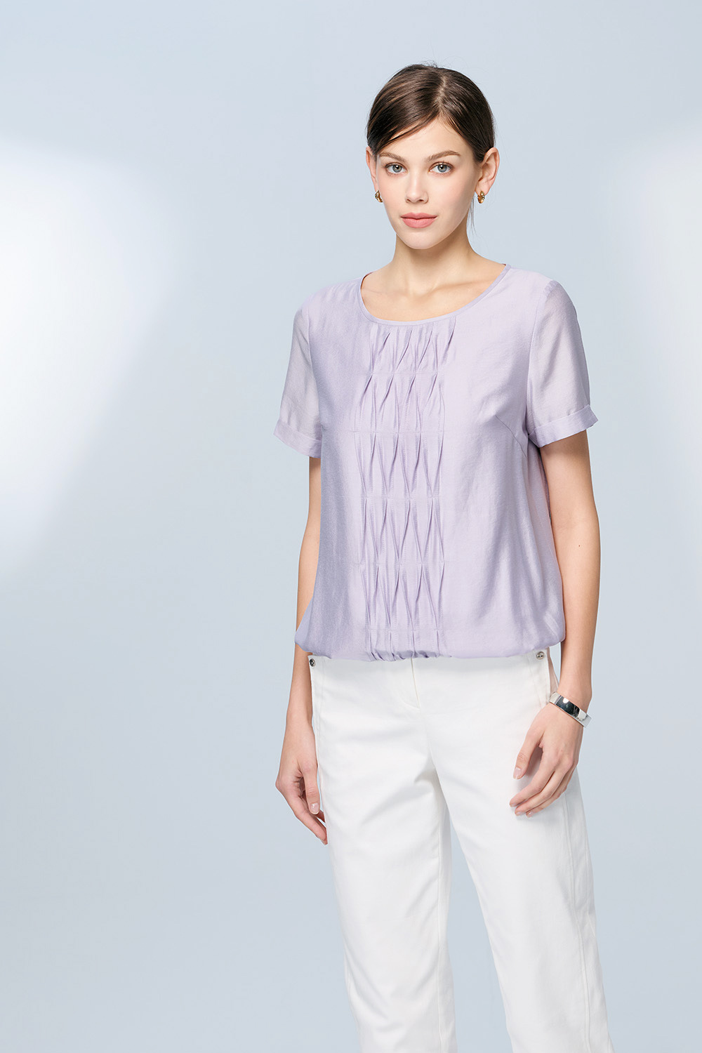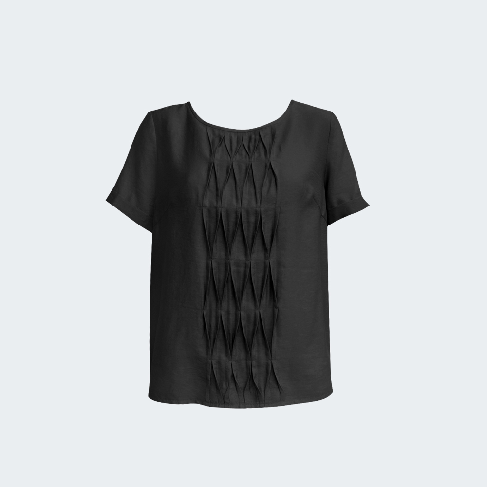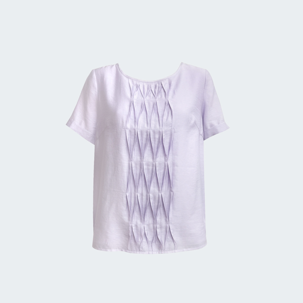 衣身正面運用立體幾何壓摺設計,打破單一平面感,巧妙修飾胸前與腰腹比例,視覺上更加挺拔有型