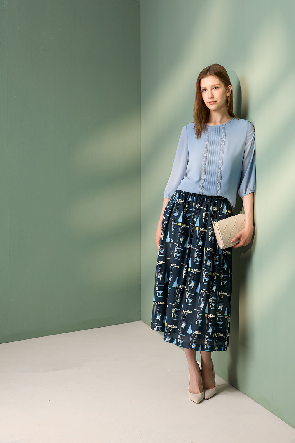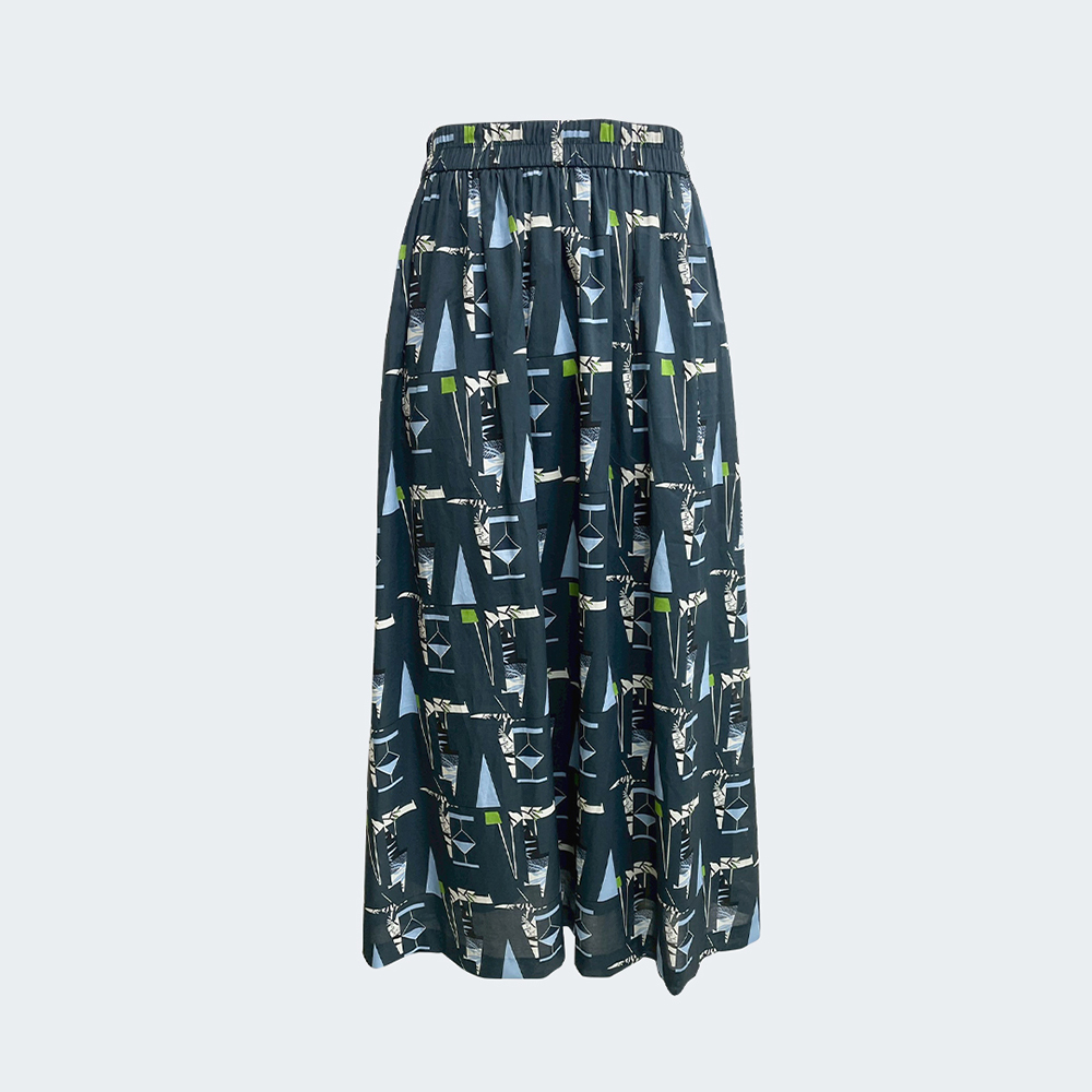 • 以沉穩藍綠調結合幾何藝術印花,打造適合職場與日常的百搭中長裙