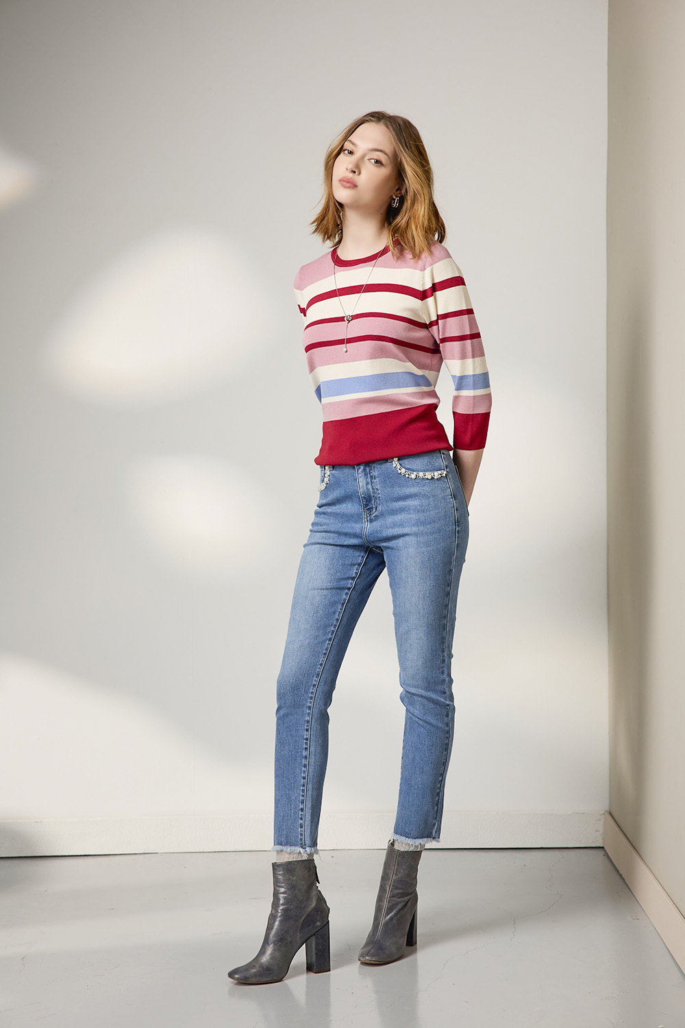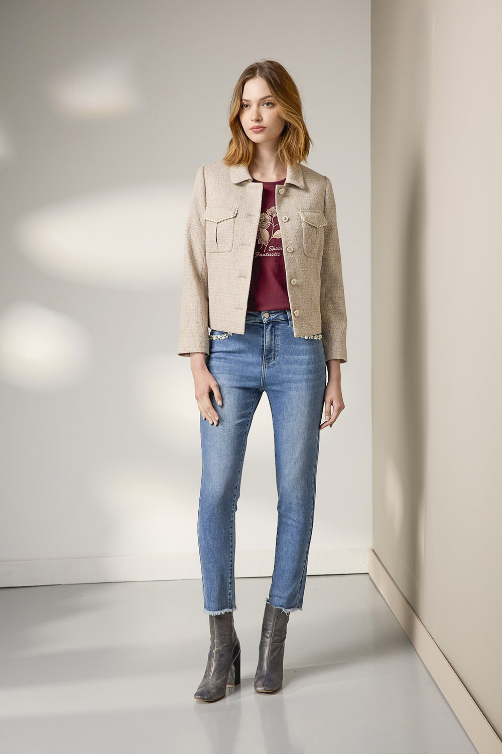 【2025 柔煦個性主題】口袋邊緣珍珠點綴,細膩中展現柔美氣息;搭配不收邊褲腳毛鬚設計,注入一絲灑脫個性,直筒剪裁修飾腿型比例,打造簡潔有型的日常穿搭