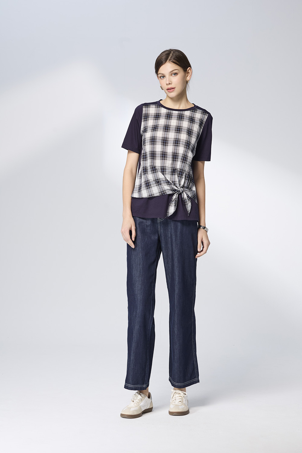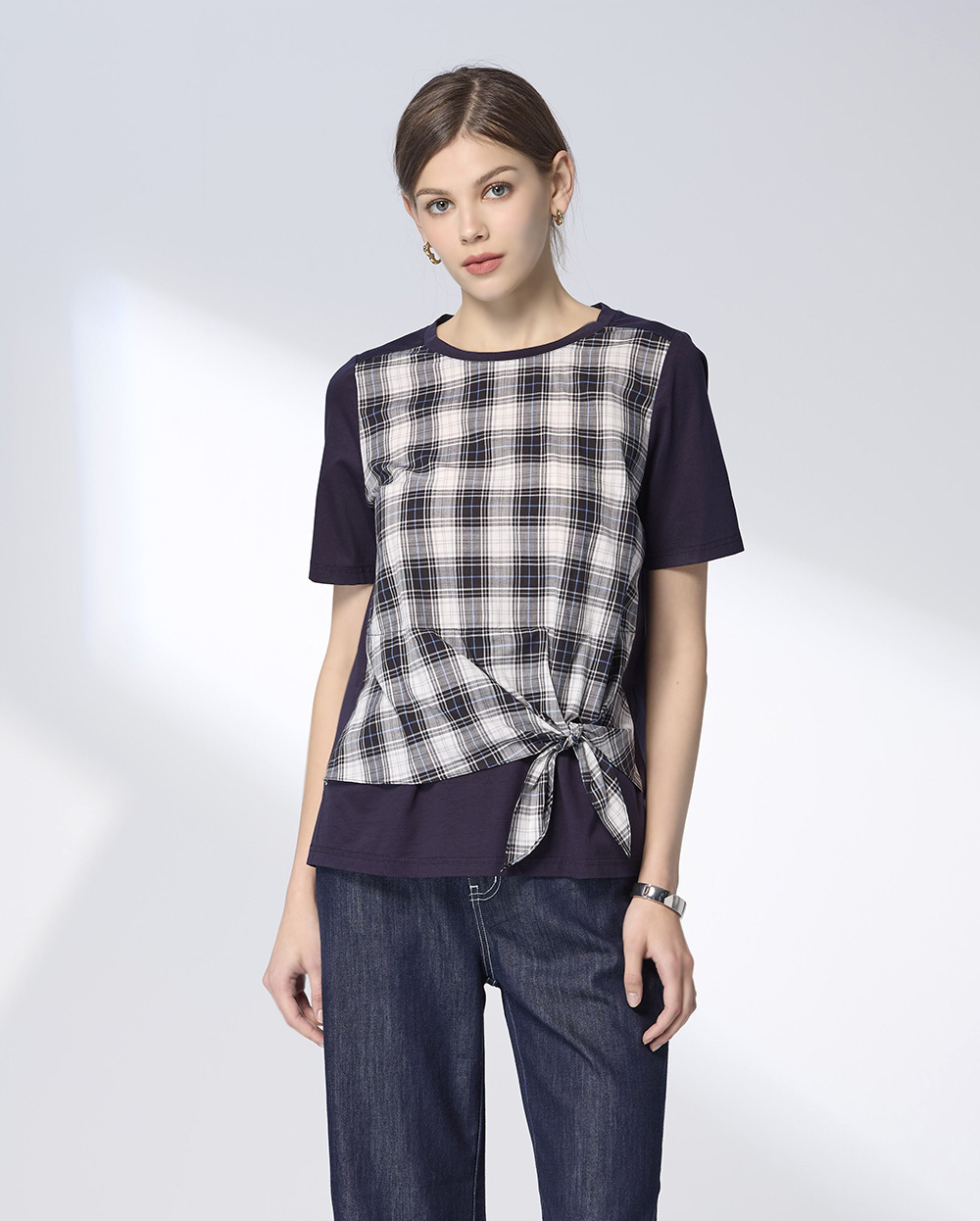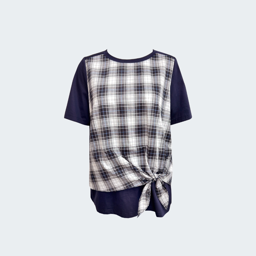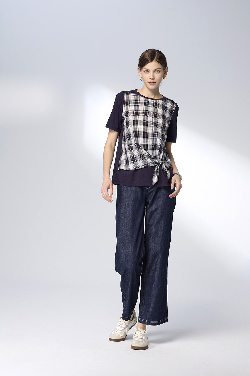 以日本純棉素材製作,舒適柔軟的素面布與格紋棉布拼接,帶來兼具清新與質感的穿搭效果