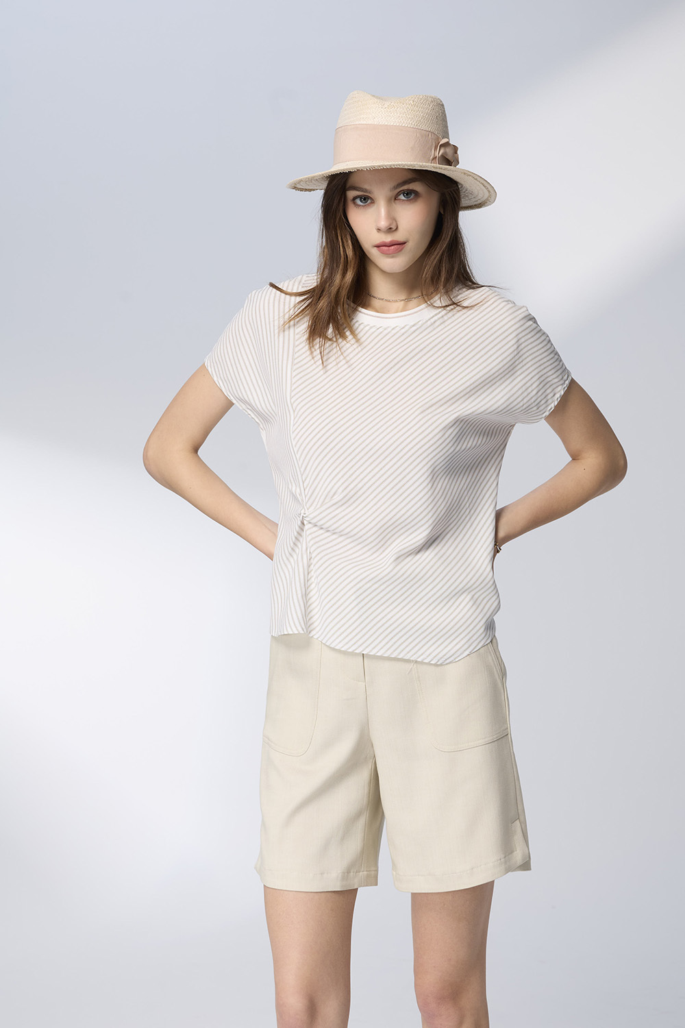 前身特別的扭結剪裁,形成自然的立體皺褶,讓簡約條紋多了幾分層次與設計感
