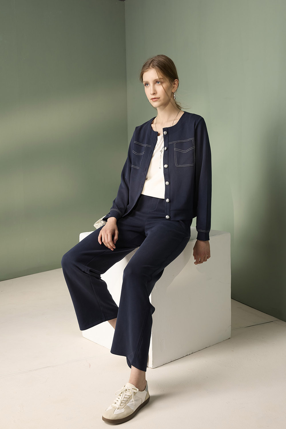 布面細緻柔滑,觸感親膚不悶熱,穿著時自然貼合身形又保有活動彈性。