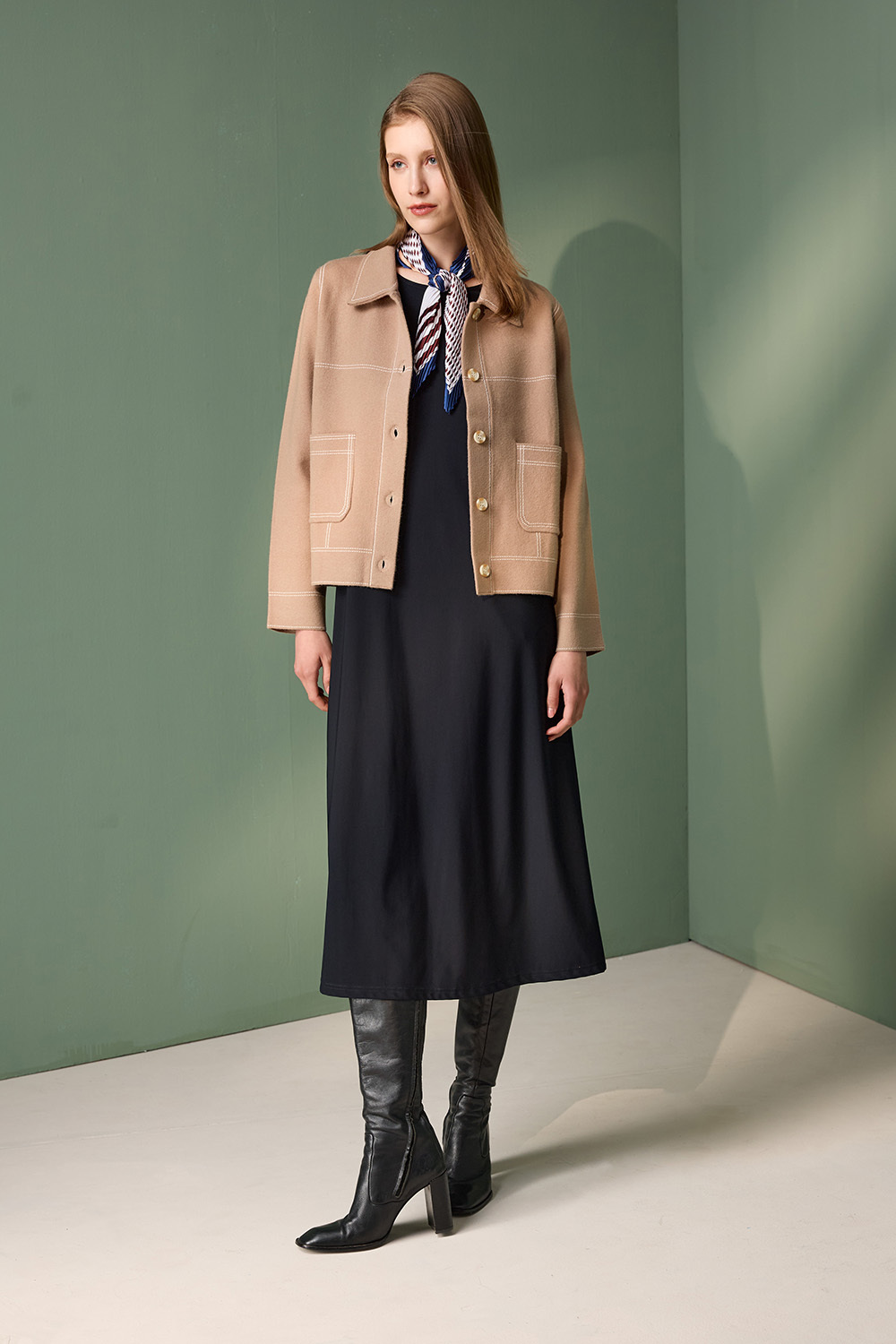 七分袖設計與中長版型,兼顧端莊與修飾效果,適合單穿或與外套、絲巾層疊搭配,輕鬆展現「都市風格」的多元穿搭