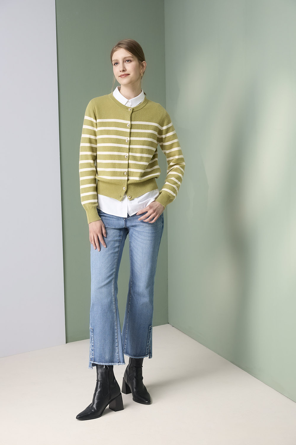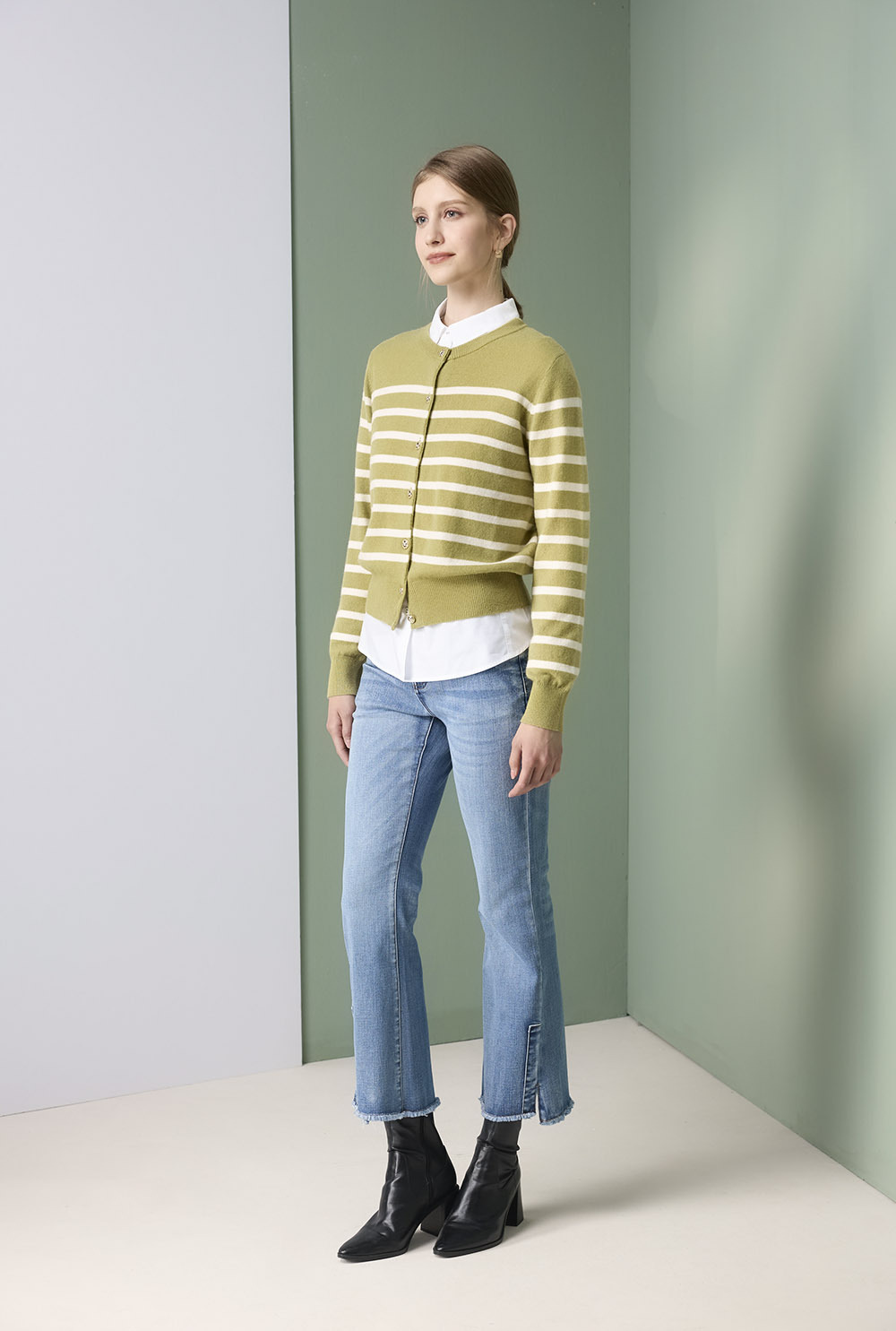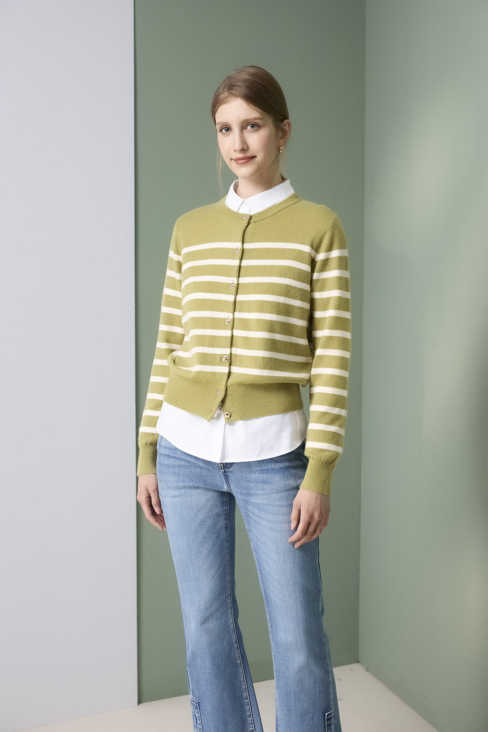 以「舒適 × 層次 × 都會日常」為主軸設計的一款條紋開襟針織,