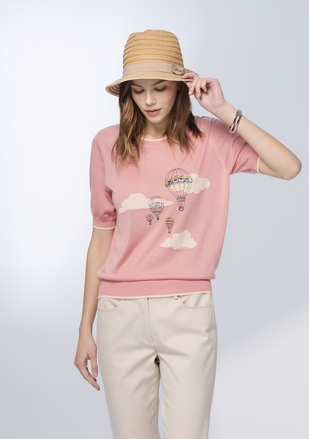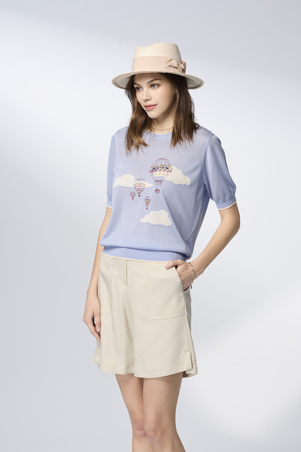 胸前雲朵與熱氣球刺繡精緻細膩,帶點童趣卻不失優雅,呼應著都會女性對生活美感的童趣與溫柔