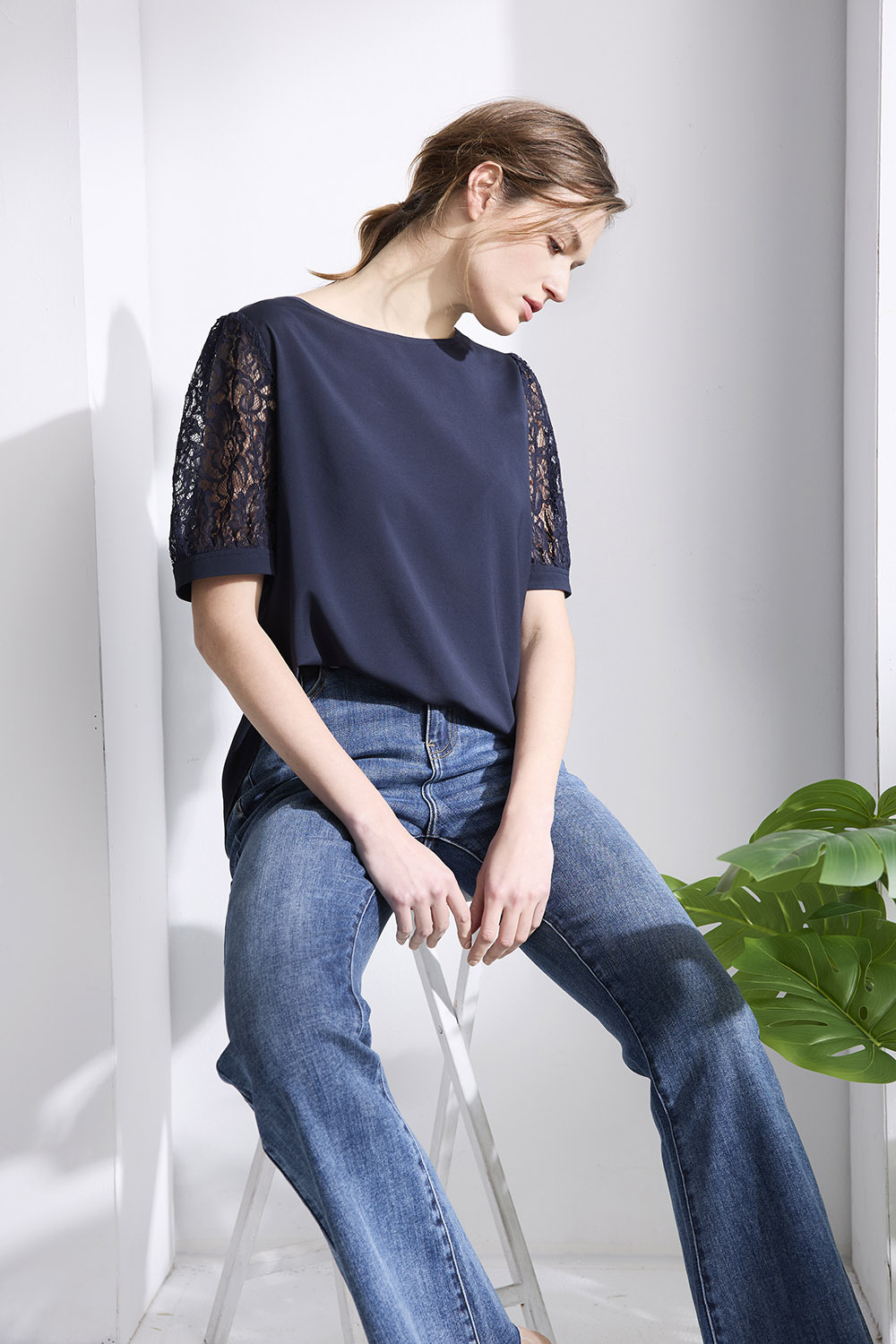 蕾絲袖的透明感為整體增添空氣感與輕盈氛圍,即使搭配牛仔褲也能穿出都市知性的迷人風格