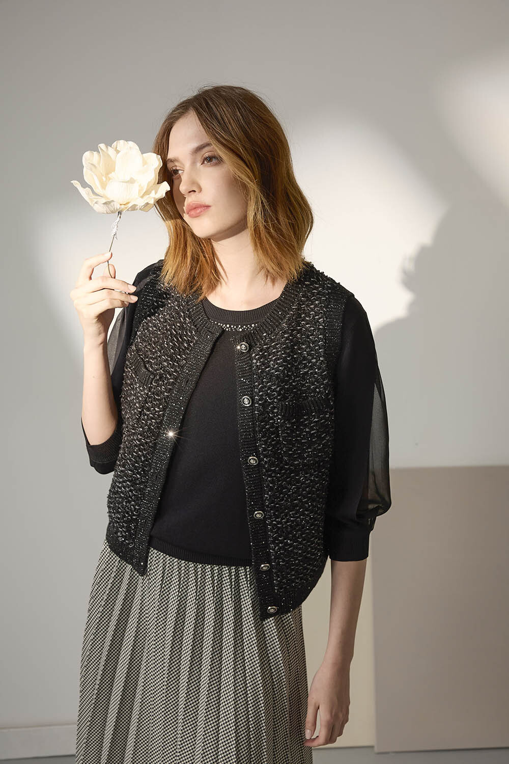 細緻的圈紗與光澤金蔥巧妙融合,讓整體呈現出柔和閃耀的高級質感,既優雅又不失日常實穿度
