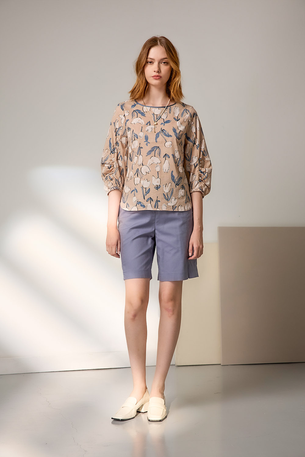 【2025 花影畫語主題】布面以水彩筆觸描繪鬱金香花影,搭配柔和大地色調,如同穿上一幅溫婉靜謐的詩意畫作;微蓬袖設計修飾手臂線條,展現知性與柔美兼具的日常風格